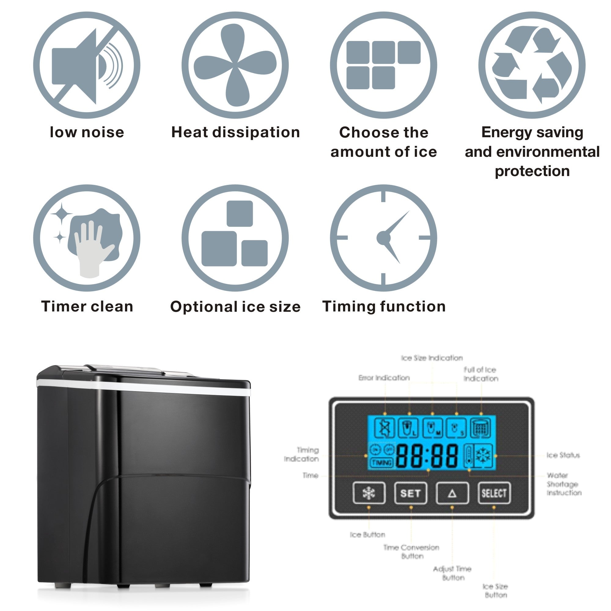SMART DESIGN - Kismile Ice Maker Machine is equipped with alarm light and automatic shutdown function as well as self-cleaning mode, which is more convenient to use with high efficiency and low noise. The LCD screen is easy to operate.